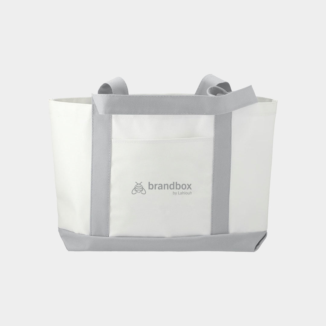 The Large Boat Tote has a large open main compartment with an open front pocket and double 23 inch handles. Disclaimer: Gusset & Handle Decorating is Transfer Only and does not qualify for one day return. One color imprint in one location.
