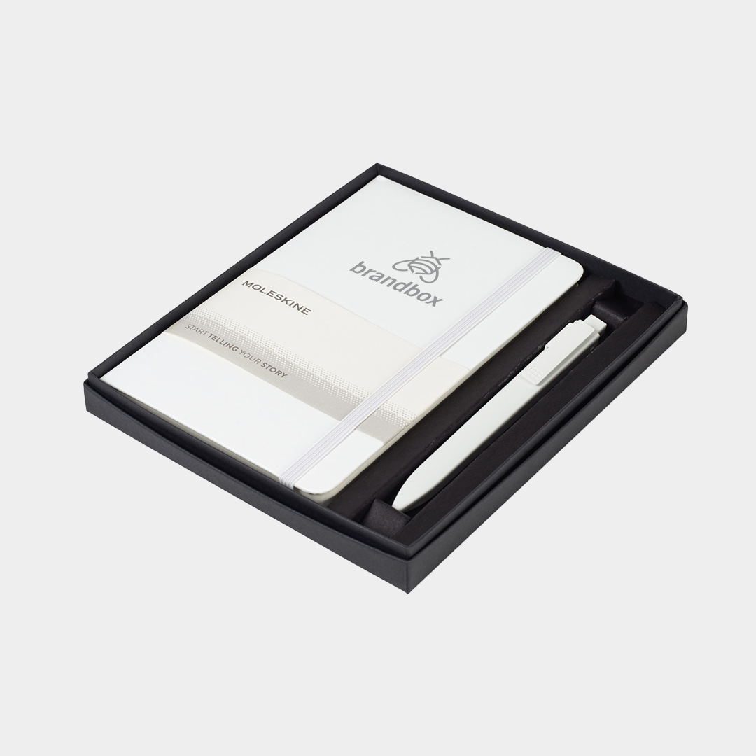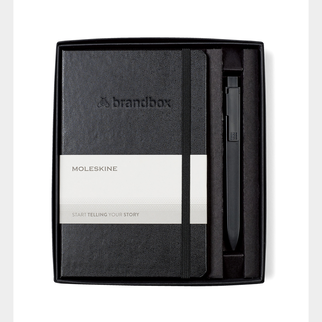 The Classic Notebook & GO Pen Set has all the tools you need to capture your thoughts on the move. GO Pen clips onto the hard cover so you can be ready to jot down notes whenever inspiration strikes. This gift set includes one Hard Cover Ruled Medium Notebook and one GO Pen packaged in a two-piece Moleskine gift box. Gift box dimensions: 6.625L 7.625H 0.875W.